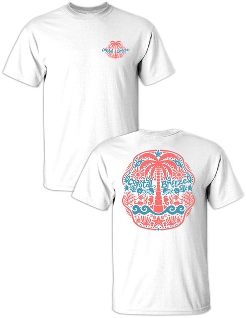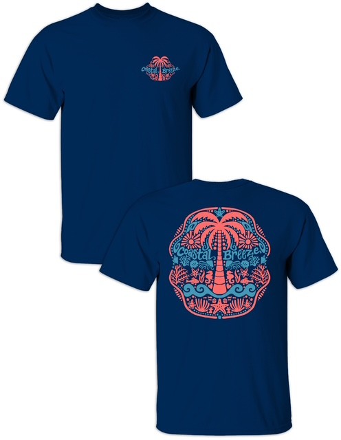 Boho Coastal Breeze Palm Tee – A relaxed coastal graphic tee featuring a vibrant coral and turquoise palm tree design. Perfect for beach lovers and free spirits, this soft unisex tee captures the laid-back vibe of coastal living. Available in white or navy.