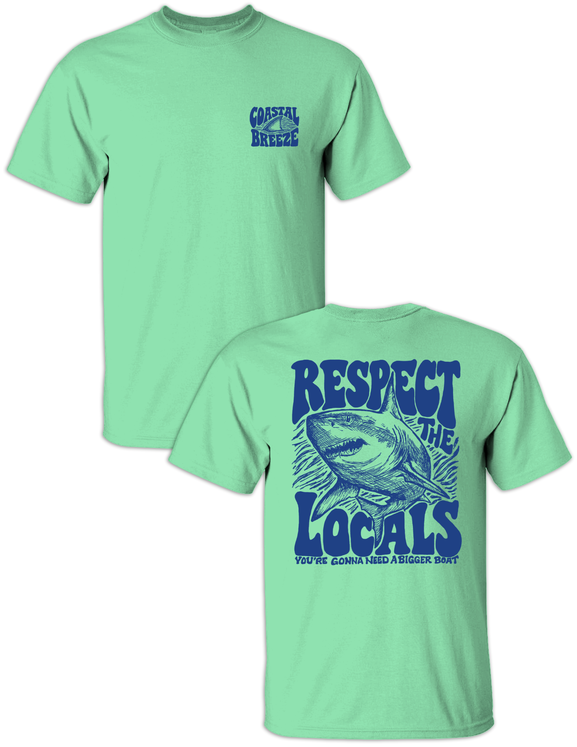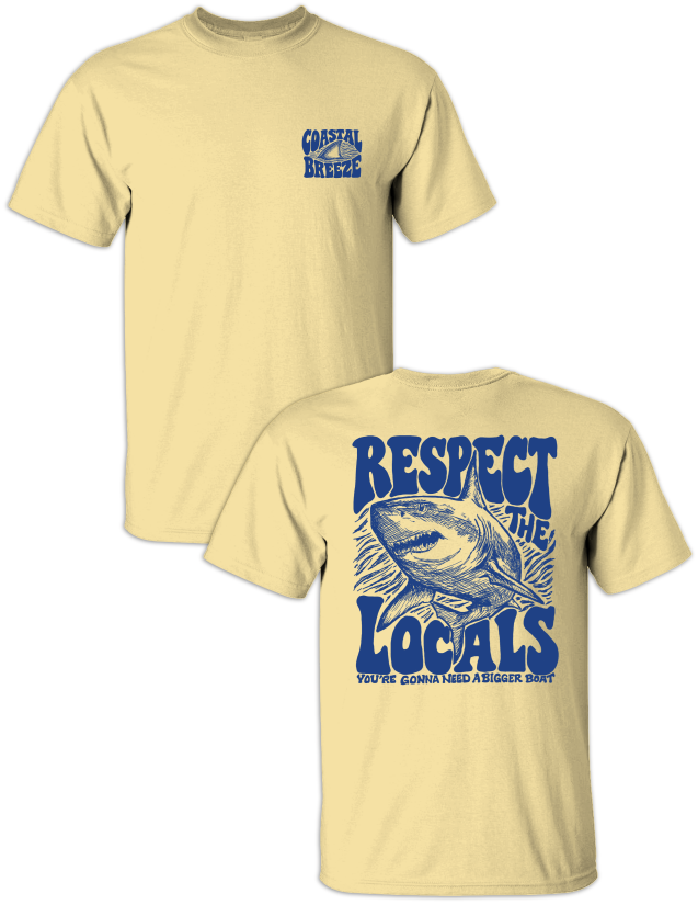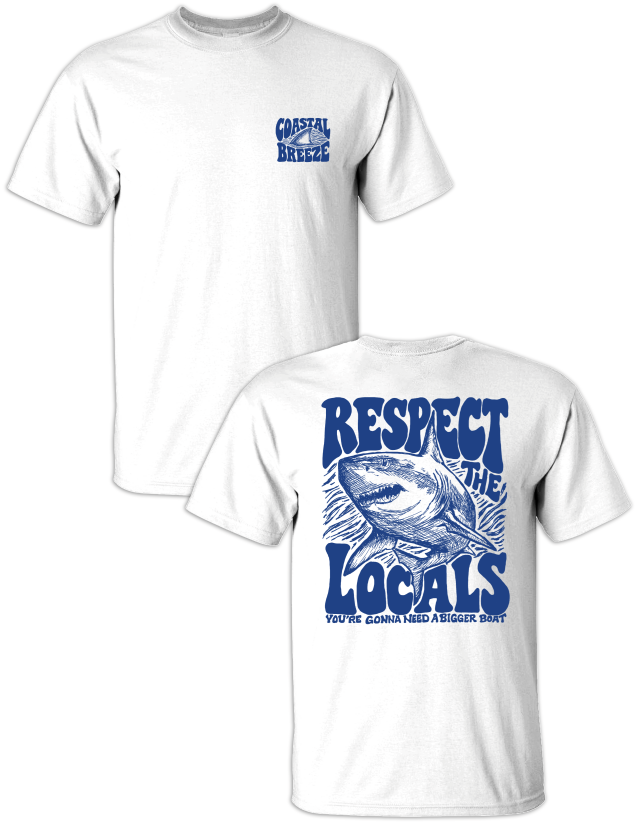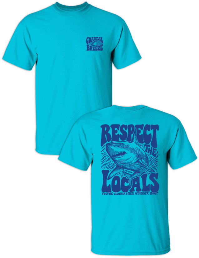 Make waves wherever you go. Our Respect the Locals tee delivers bold coastal attitude with a hand-drawn shark graphic and a classic ocean-inspired phrase. Printed on a soft, beach-ready shirt and finished with a subtle Coastal Breeze logo on the front, this tee is perfect for boat days, beach weekends, and anyone who knows who really rules the water. A laid-back coastal staple with just the right amount of bite.