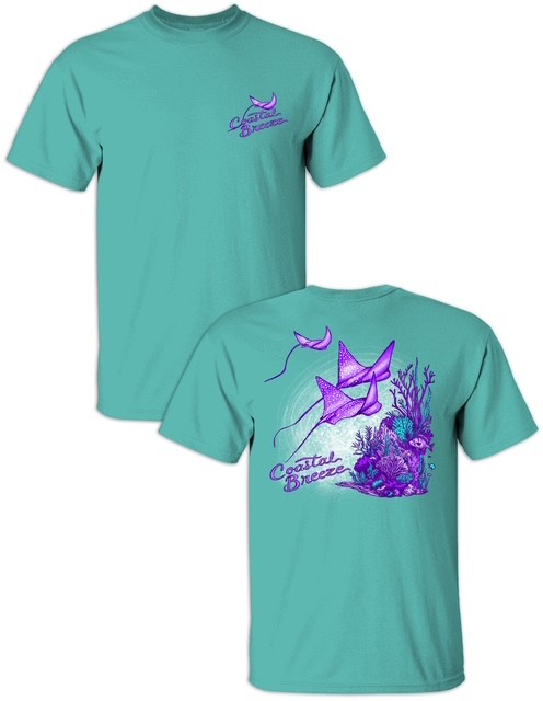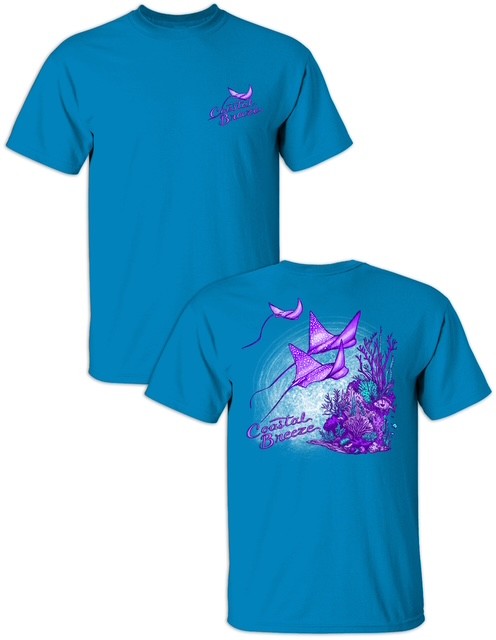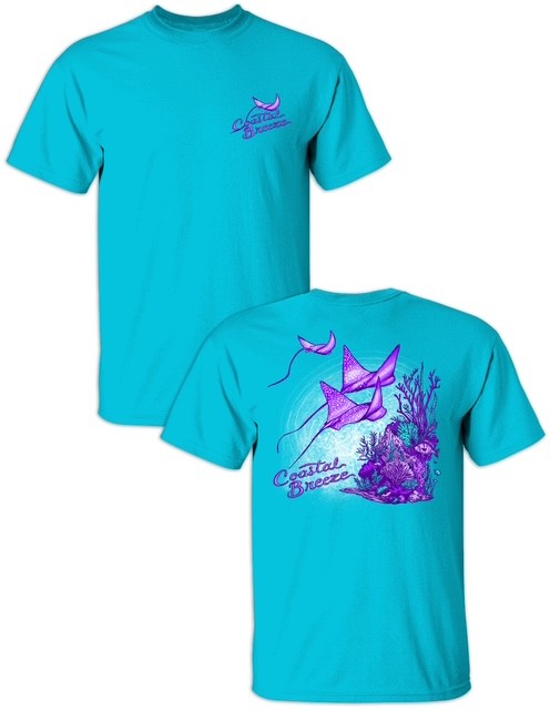Make waves in our Coastal Breeze Stingray Tee! Featuring vibrant purple stingrays and detailed coastal reef artwork, this eye-catching design brings bold beach vibes to any wardrobe.